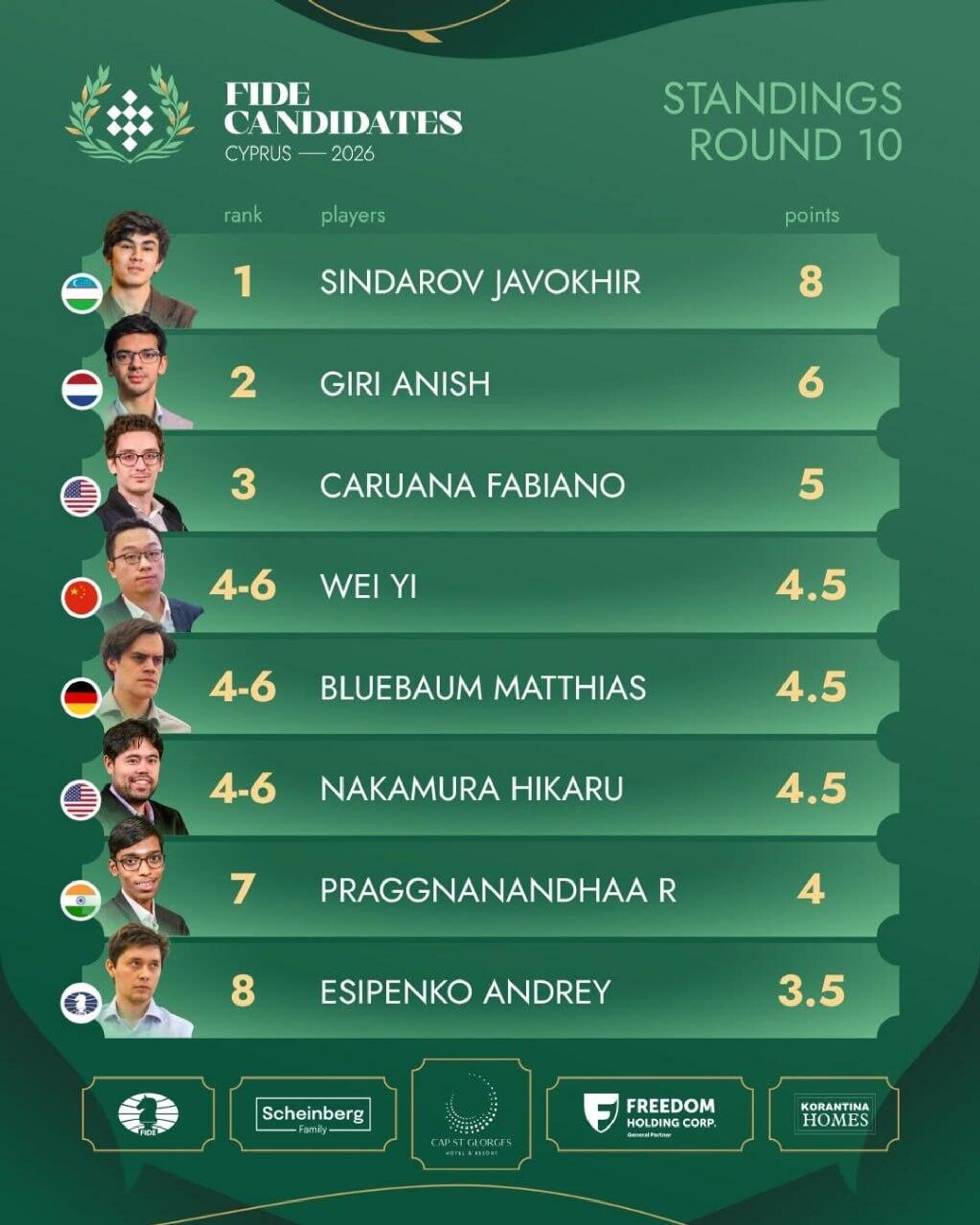 Ayni paytda hamyurtimiz va boshqa da’vogarlar o‘rtasidagi farq sezilarli darajada kengaygan: Anish Giri ikki ochko, Fabiano Karuana esa uch ochko ortda qolmoqda. 10-turda raqiblarning durang o‘ynashi Sindarovning pozitsiyasini yanada mustahkamladi.