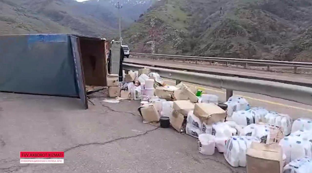 Qamchiq dovonida yuk mashinasi ag‘darilib, mahsulotlar yo‘lga sochilib ketdi. FVV qutqaruvchilari halokat oqibatlarini b