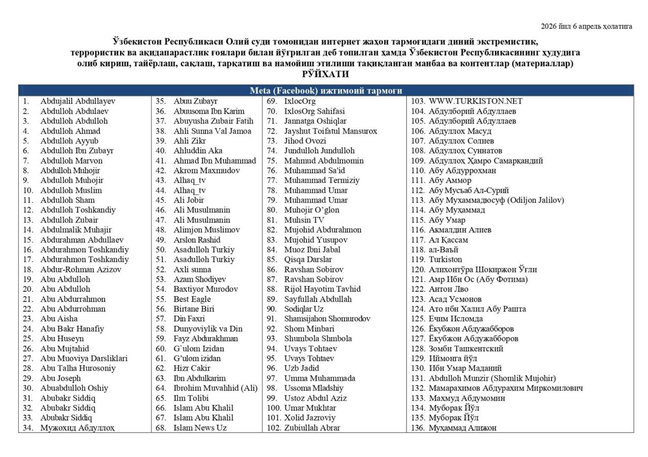 • Список содержит сотни ссылок на страницы в Meta (Facebook) и Instagram. Под запрет попали профили таких проповедников и деятелей, как Абдуллох Зуфар, Садик Самаркандий, Махмуд Абдулмомин и Абдували кори.