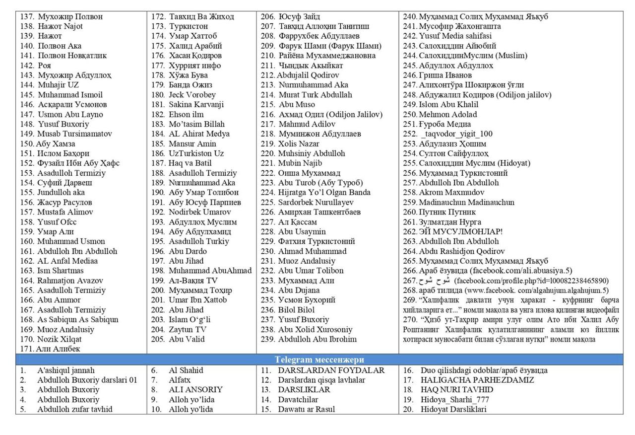 Верховный суд Узбекистана опубликовал обновленный список из сотни запрещенных Telegram-каналов и страниц в соцсетях, содержащих экстремистские идеи.